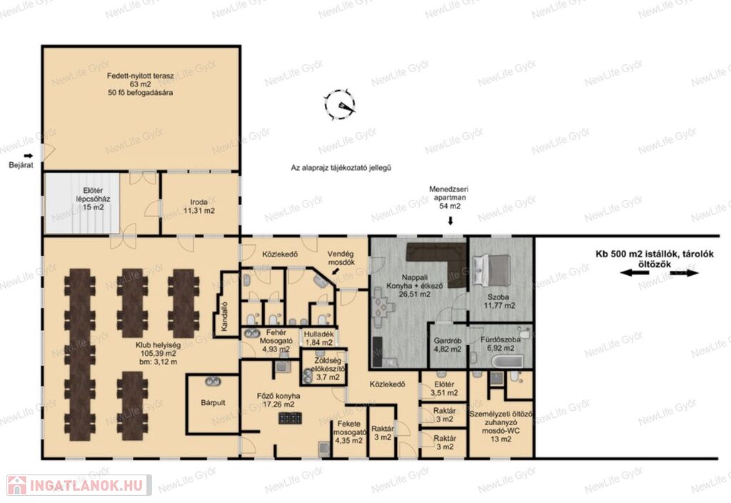 63 m2-es fedett, körbekerített-nyitott terasz (50 fő befogadására alkalmas)