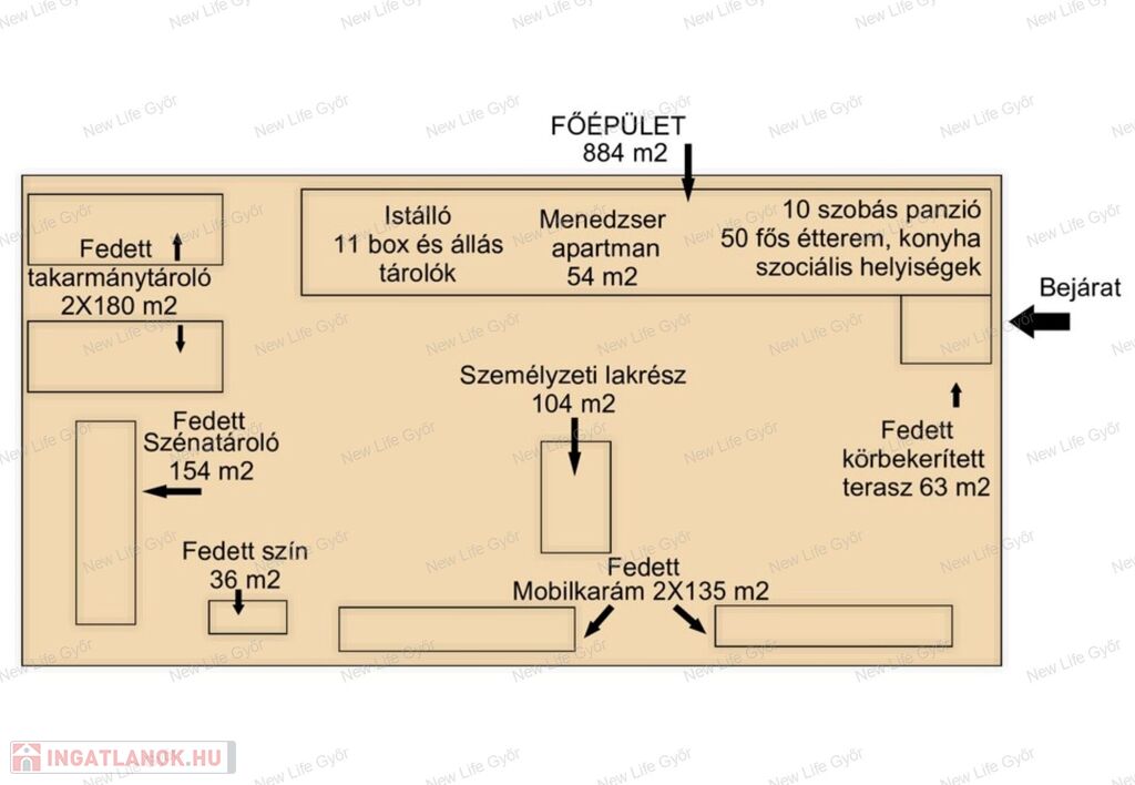 357 m2-es főistálló (11 istálló (3X3m) + 11 férőhely lovaknak, nyeregtárolóknak)