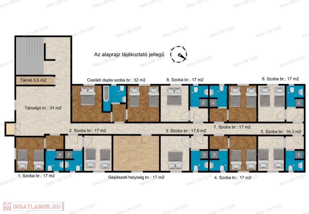 -104 m2-es személyzeti lakrész (Nappali+3 szoba, konyha, fürdőszoba)