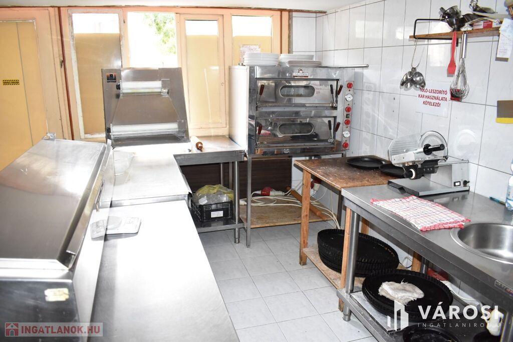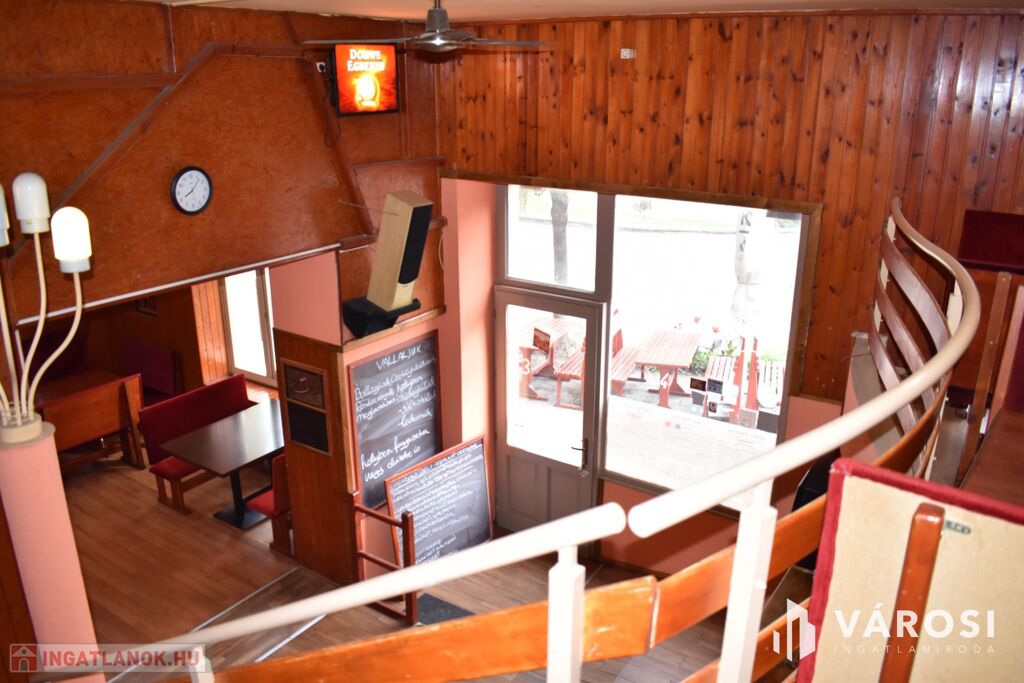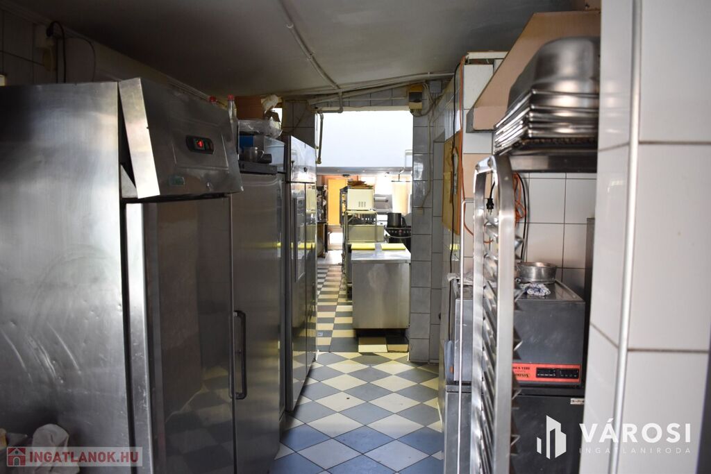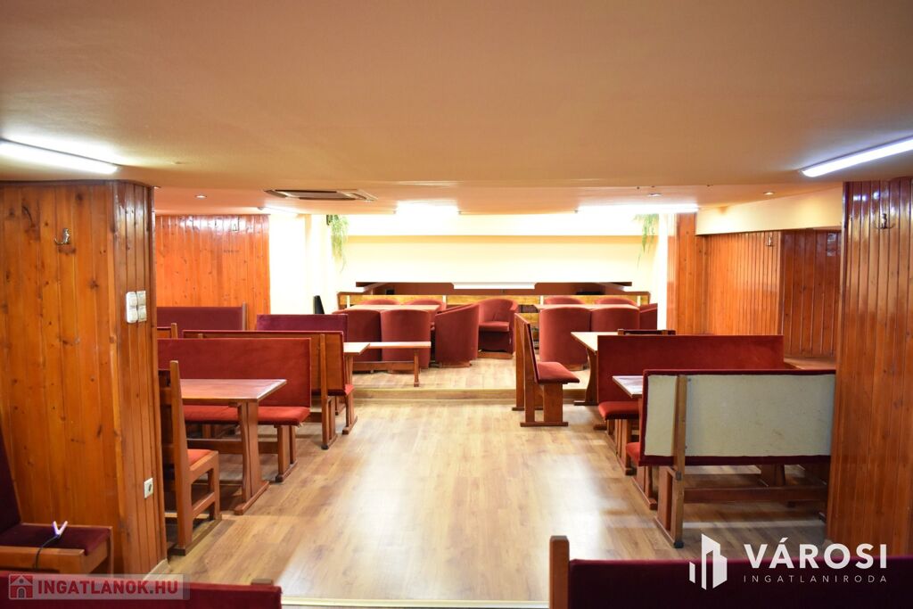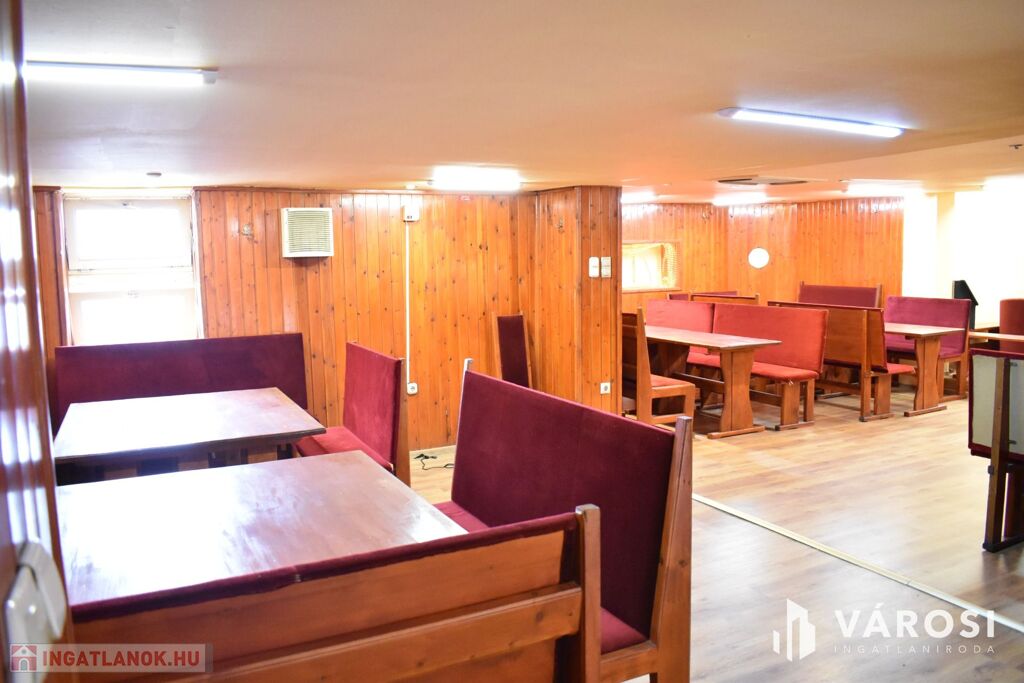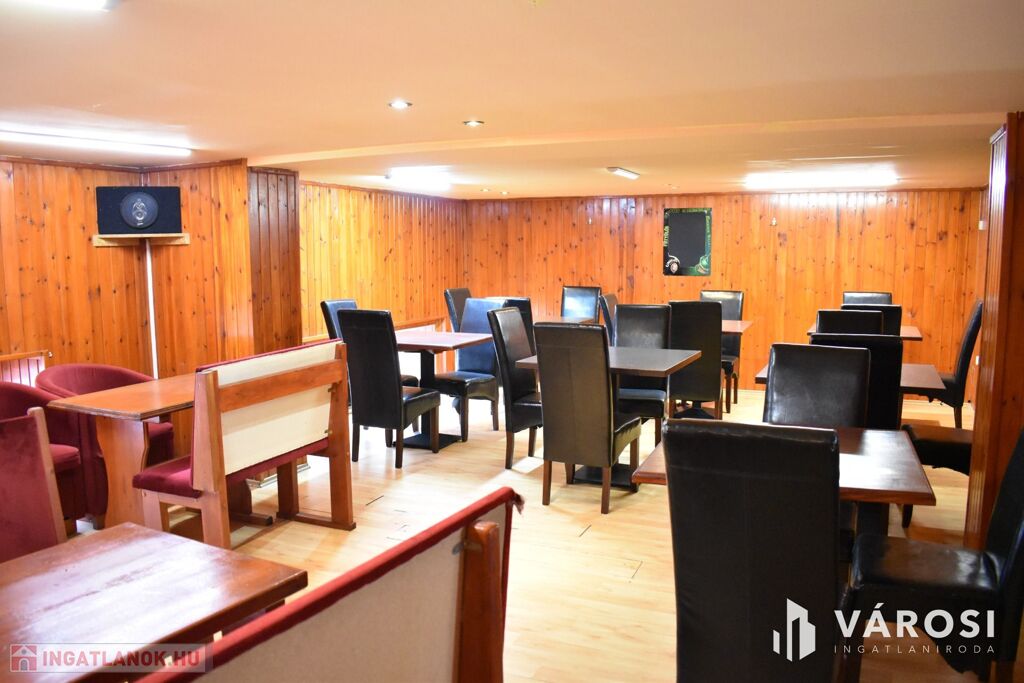 Az ingatlan földszinti részén lett kialakítva egy hangulatos és minden igényt kielégítő bárpult, egy éttermi vendéglátó rész, amely a kialakított szintén hangulatos galéria résszel közel 200 fő befogadásra alkalmas. A galéria rész ebből 104 fő befogadásra alkalmas, ahol a kialakításának köszönhetően zártkörű rendezvények lebonyolítására is tökéletesen alkalmas. A vendéglátó részen a közelmúltban lettek felújítva a vizesblokk (mosdó, WC) helységek is, amelyből 3 db. található az éttermi részen (férfi, női és mozgáskorlátozott). A vendéglátó egységhez tartozik egy hatalmas és modern eszközökkel felszerelt konyha, amely több részből áll, itt lett kialakítva egy pizza készítő, melegkonyha, előkészítő, mosogató, illetve több hűtő, raktár és mosdó helység is. A fűtésről 3 db gázkazán lapradiátorokkal, padlófűtéssel, a hűtésről klímaberendezések gondoskodnak. A vendéglátó részen az elektromos hálózat is korszerű, itt 3 x 72 A és ipari áram található.