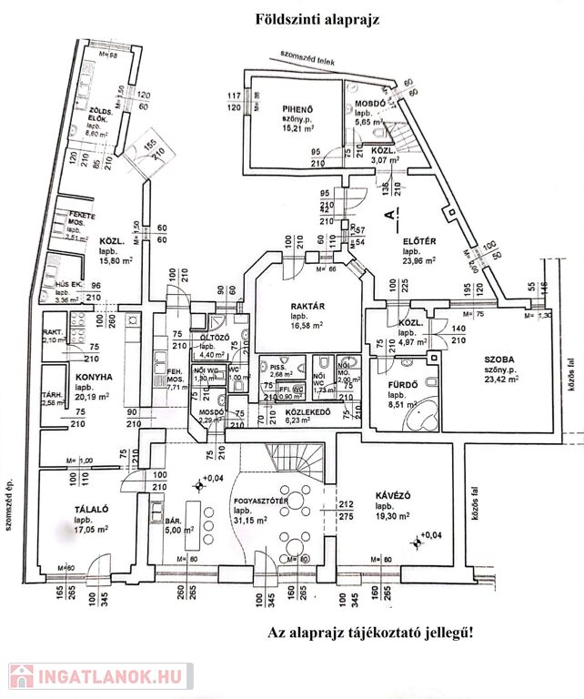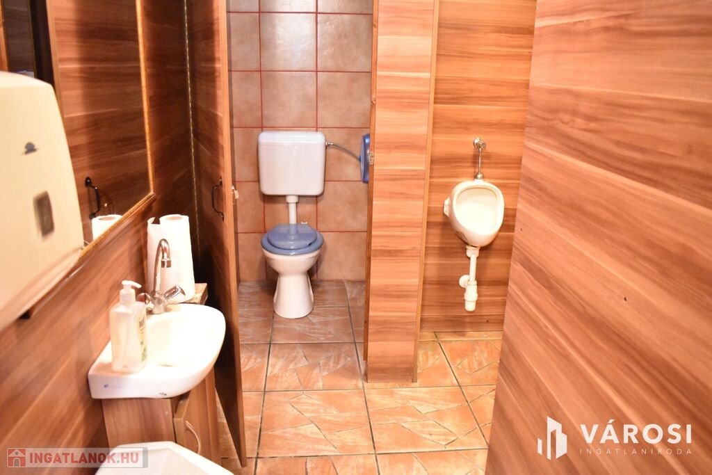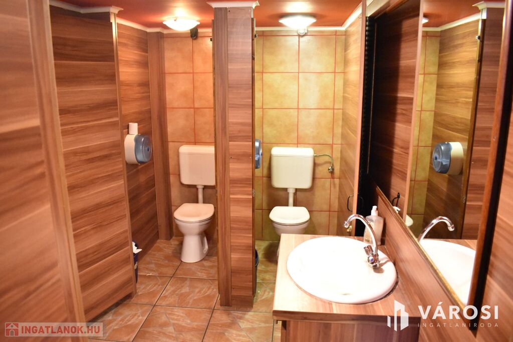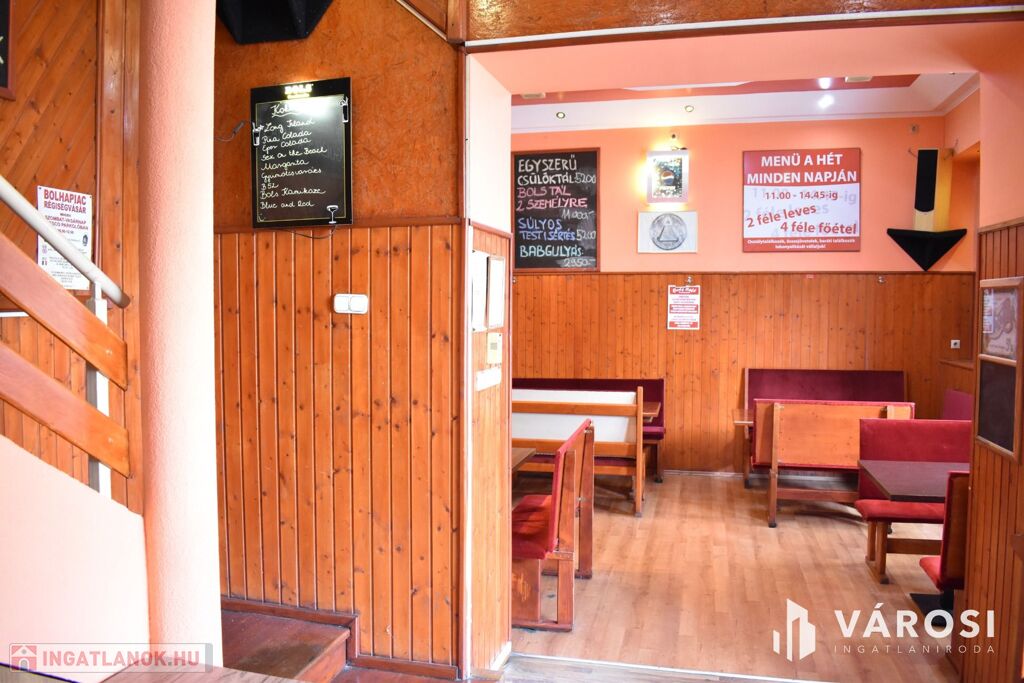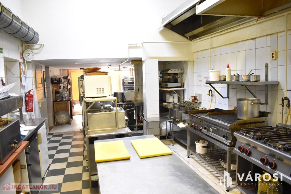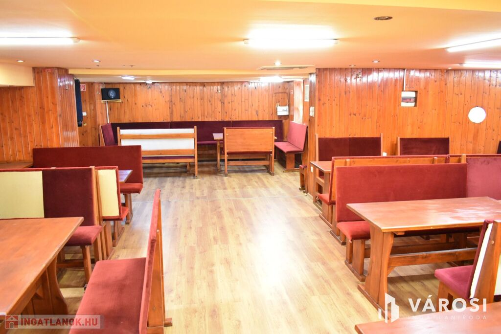 Az ingatlan földszinti részén lett kialakítva egy hangulatos és minden igényt kielégítő bárpult, egy éttermi vendéglátó rész, amely a kialakított szintén hangulatos galéria résszel közel 200 fő befogadásra alkalmas. A galéria rész ebből 104 fő befogadásra alkalmas, ahol a kialakításának köszönhetően zártkörű rendezvények lebonyolítására is tökéletesen alkalmas. A vendéglátó részen a közelmúltban lettek felújítva a vizesblokk (mosdó, WC) helységek is, amelyből 3 db. található az éttermi részen (férfi, női és mozgáskorlátozott). A vendéglátó egységhez tartozik egy hatalmas és modern eszközökkel felszerelt konyha, amely több részből áll, itt lett kialakítva egy pizza készítő, melegkonyha, előkészítő, mosogató, illetve több hűtő, raktár és mosdó helység is. A fűtésről 3 db gázkazán lapradiátorokkal, padlófűtéssel, a hűtésről klímaberendezések gondoskodnak. A vendéglátó részen az elektromos hálózat is korszerű, itt 3 x 72 A és ipari áram található.