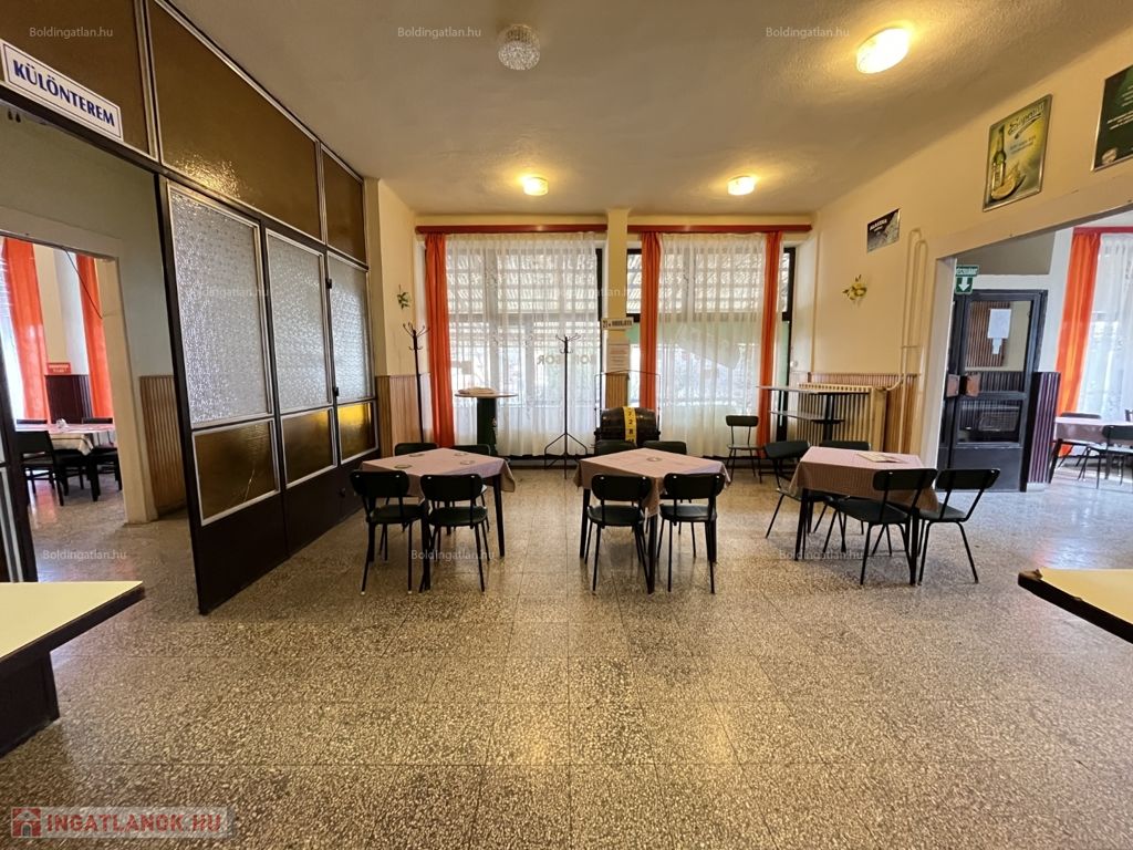 Hetesen kifejezetten forgalmas helyen lévő, évtizedek óta jól működő 295 m2-es – akár azonnal birtokba vehető - vendéglátó egység (söröző-étterem) akár 200 fő részére teljes berendezéssel és felszereléssel együtt eladó. Az épületben előtér, tágas étterem, bárpult-söntés, különterem, folyosó, konyha, előkészítő, iroda, személyzeti WC és öltöző, 6 db raktárhelyiség, eszköztároló, pince, továbbá vendég női-, és férfi WC helyiségek kerültek kialakításra, alatta egy részen pince is van. Az üzlethelyiség előtt egy nagy fedett terasz van, mögötte pedig két raktárhelyiség található. A fűtése 2 db gázkazánnal és 2 db cserépkályhával megoldott. Telek: 1.632 m2