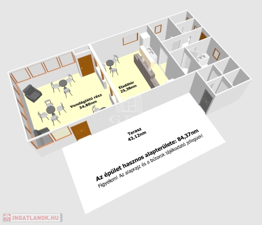 Az ingatlan ideális választás lehet azok számára, akik üzleti szempontból egy központi helyen lévő üzlethelységet vagy vendéglátóhelységet szeretnének. Továbbá kiváló választás lehet azok számára is, akik egy jó lakó ingatlant szeretnének a település központjában, hiszen az épület gyorsan átalakítható lakóházzá is.