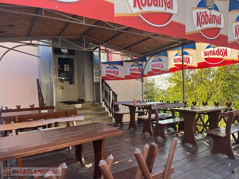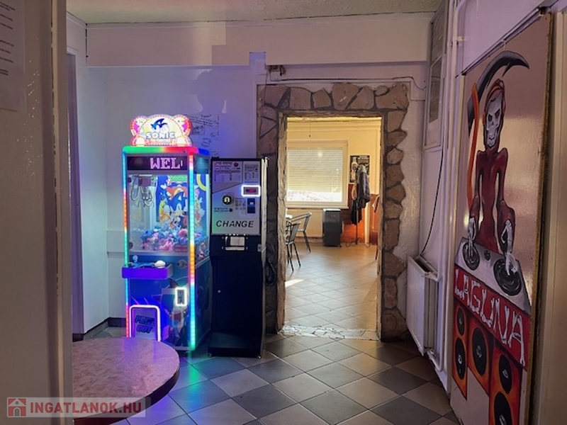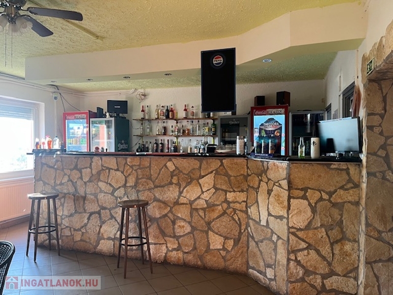 Itt egy nagy terem, a söröző pulttal és asztalokkal kisebb helyiségben, konyha, közlekedő, le- és feljáró, 2 vizesblokk (női- férfi WC), valamint a főbejárat van, előtte 6 asztalos terasszal.