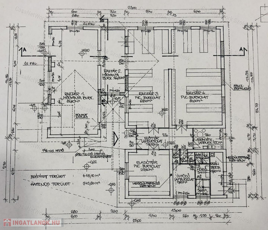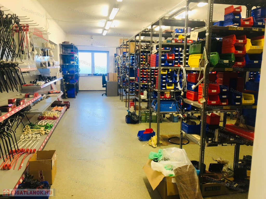 - helyiségek: 1., 2., 3., 4. jelű raktárak; személyzeti étkező, előtér, közlekedő, eladótér, szociális helyiségek, öltöző, fürdőszoba, 2 WC, kazánház