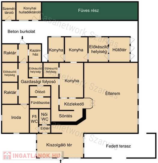 - Az egységben kiszolgáló rész, étterem, előtér, női és férfi mosdó, gazdasági folyosó, közlekedő, öltöző, fürdőszoba illemhelyiséggel, konyha, hűtőtér, előkészítő helyiségek, iroda, raktárak, kazánház, terasz lett kialakítva.