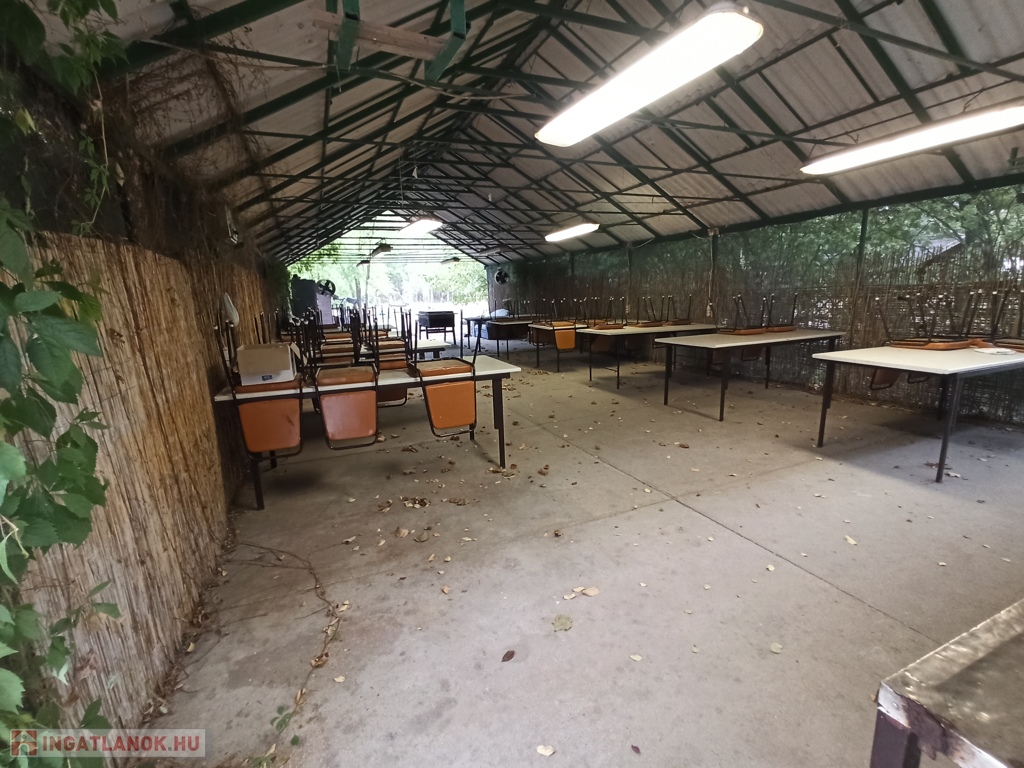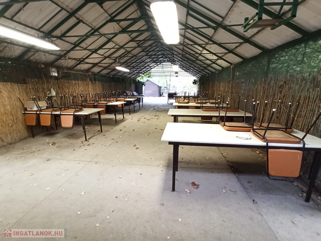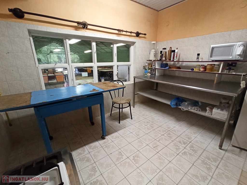 A teljes épület cca 110 nm. A nagykonyhához tartozik egy közösségi tér melyen kb 50-70 fő tud leülni és étkezni. Az udvar erdő felőli részén van 14 fabungaló, mely 3 fő elszállásolására alkalmas / bungaló.