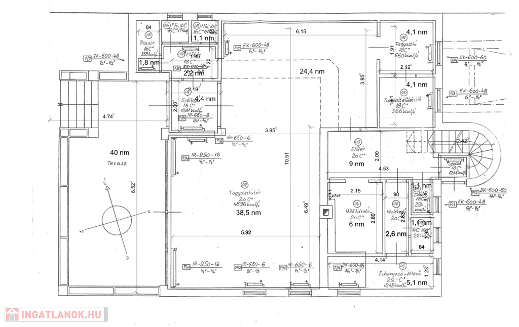 A földszinten melynek hasznos alapterülete: 106,6 nm + 40 nm terasz, és a pinceszinten 103,2 nm működik az ételbár, a tetőtérben egy 82,3 nm alapterületű lakás van kialakítva.