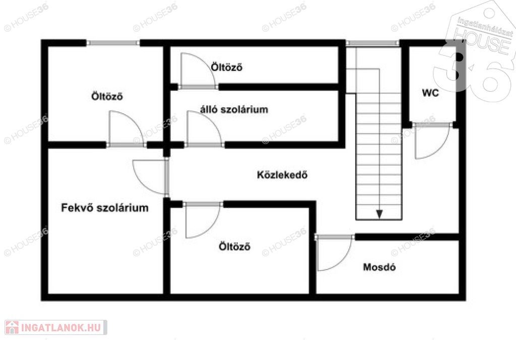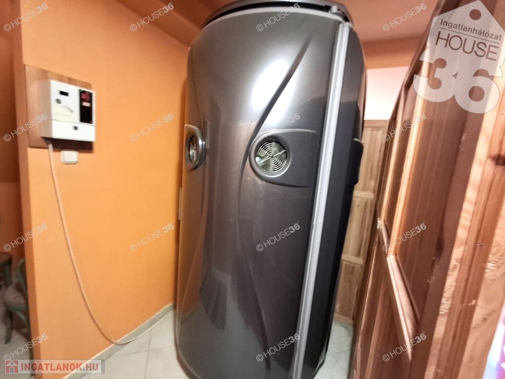 ennek emeletén ( kb. 40 m2) álló és fekvő szoláriumok, valamint hozzátartozó öltözők, mellék helyiségek, továbbá