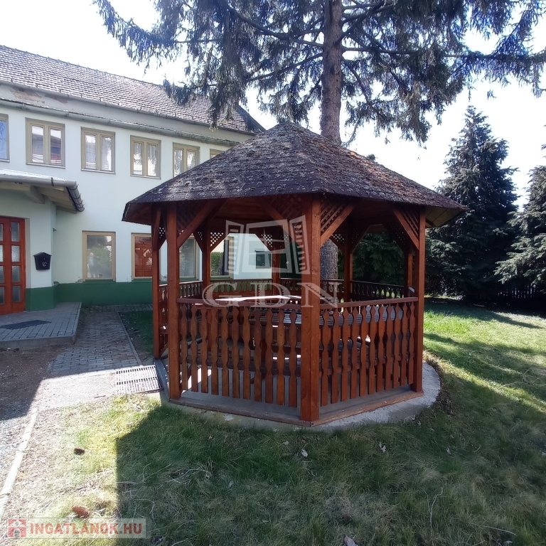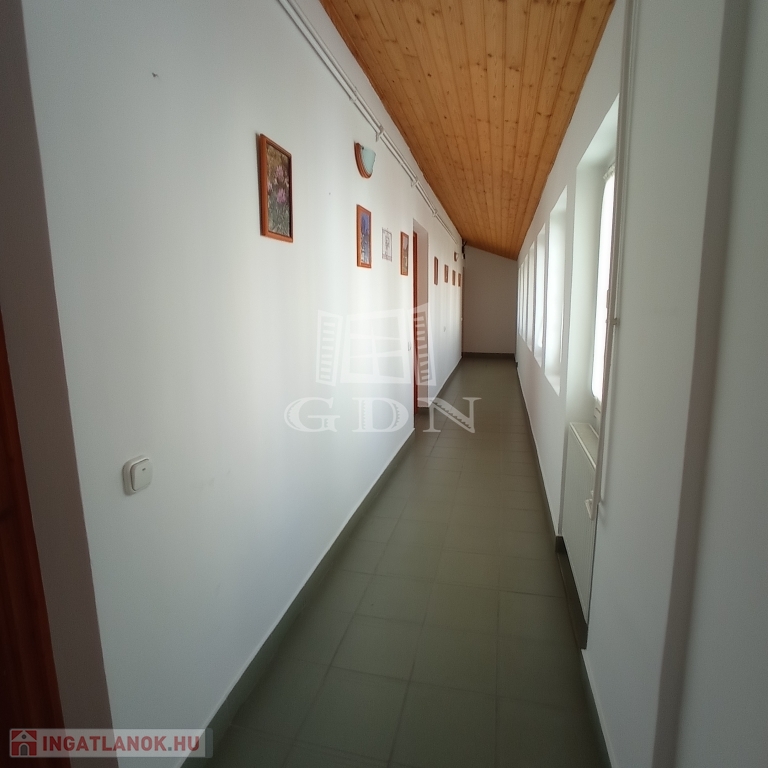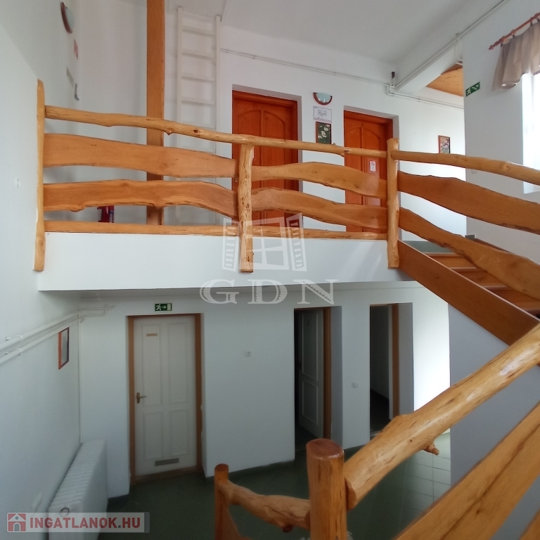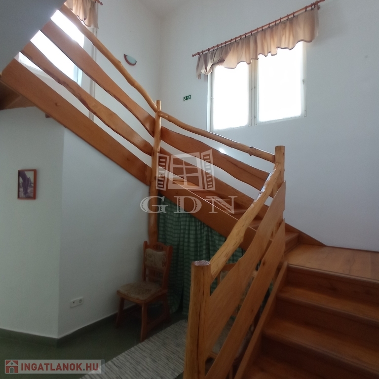 Az alsó szinten található az étkező (20 fő), konyha, iroda, mosókonyha, 2 mosdó.