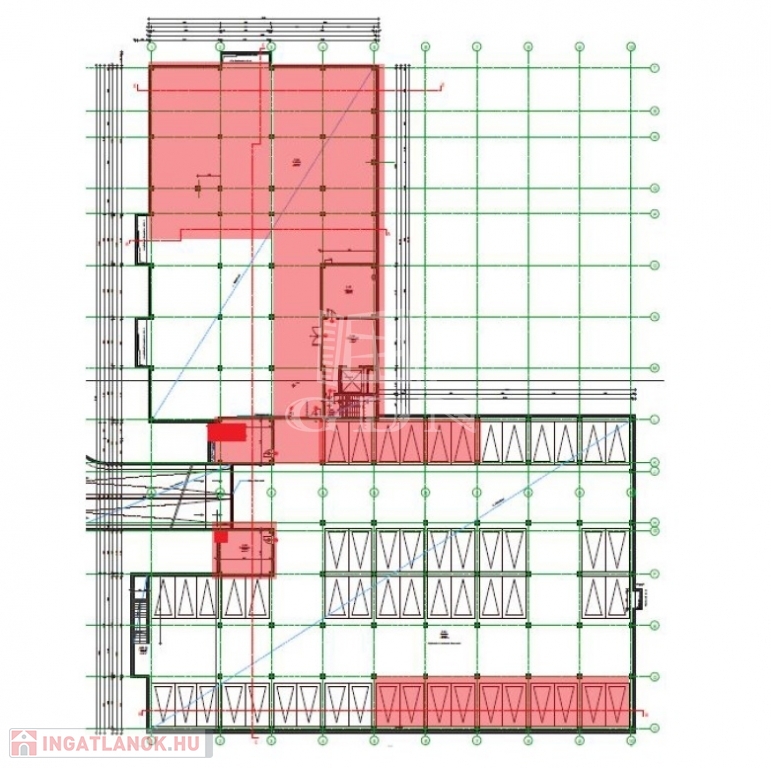 Az alaprajzon jelölt három angol aknán keresztül természetes fény szűrődik be, amely területek optimálisak raktárirodák kialakítására.