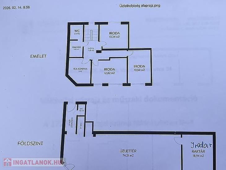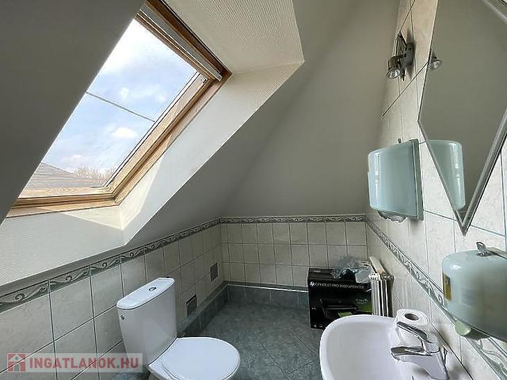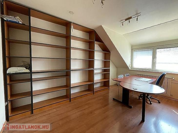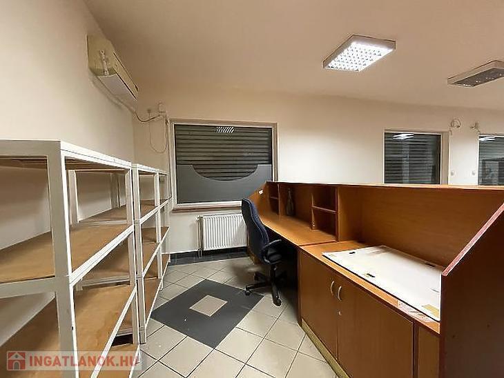 Az 56 m²-es emeleten két különálló irodahelyiség, egy teakonyha, egy mosdó, valamint egy kisebb raktár található, így az emelet ideális adminisztratív vagy irodai funkciók ellátására.