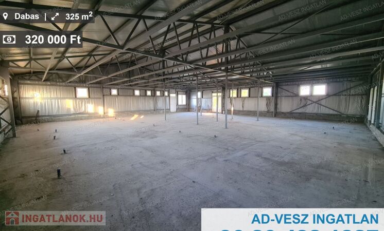KIADÓ 325M2 raktár / csarnok kiadó Dabas jól megközelíthető, központ közeli helyén, ipari árammal, azonnal költözhetően!
