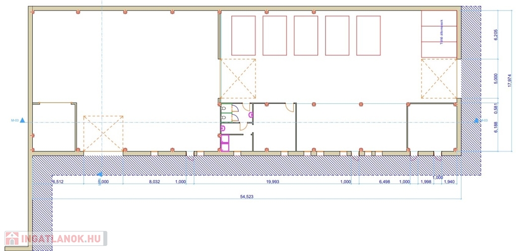A csarnok épületen belül az emelti szinten helyezkedik el 161 m2-es, klimatizált iroda, szociális felület, ennek méretezett alaprajzi elrendezése a fotók között található.