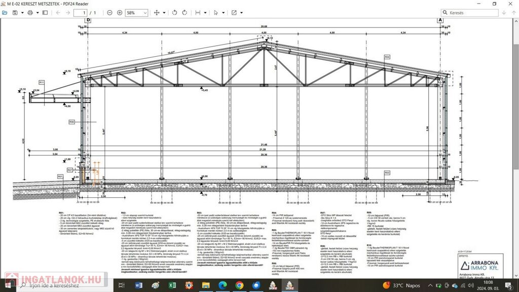 - Tető: 14 cm vastag hőszigeteléssel ellátott acél trapézlemez