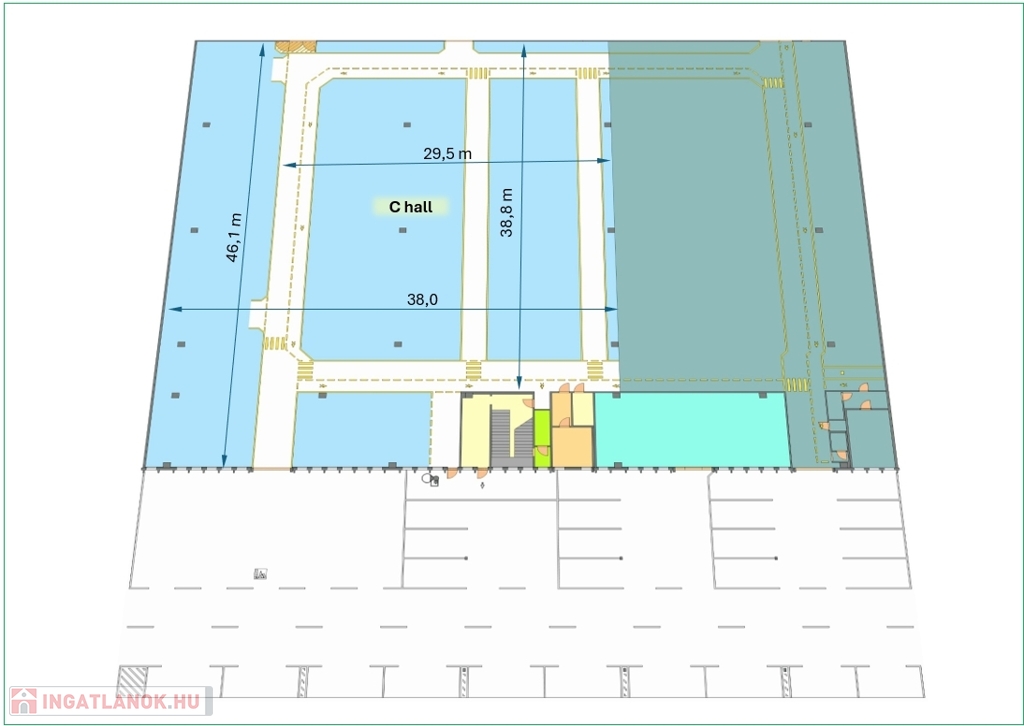 A csarnok területe 1 685,4 m2, melyből 276,7 m2 berendezett magaspolcos raktár, 181,1 m2 fejépületi csarnokrész, 23,8 m2 szociális helyiség.