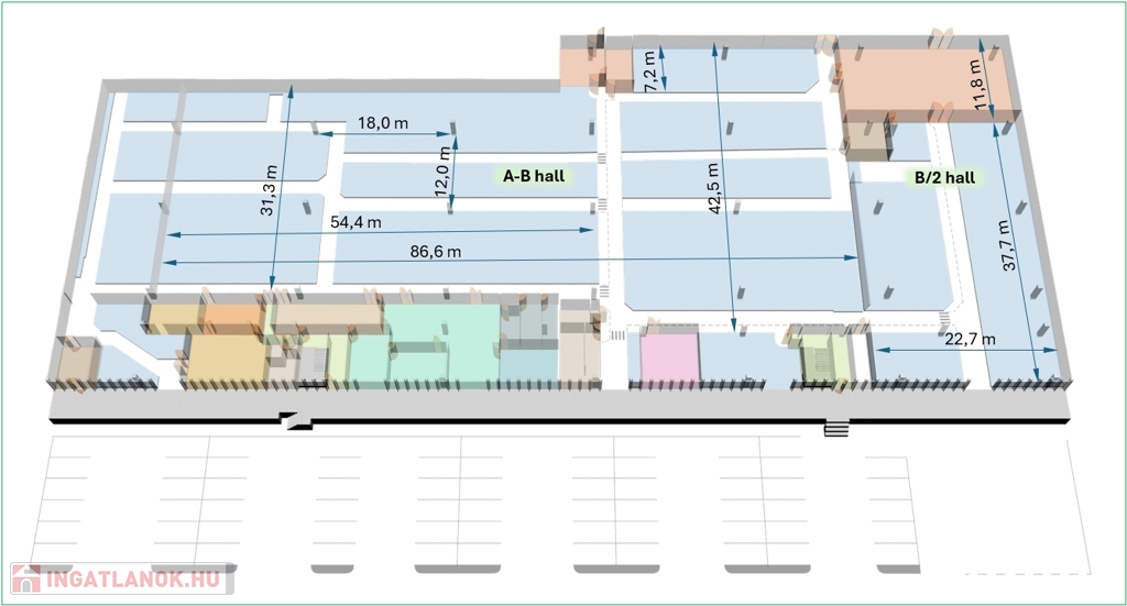 Területmegosztás: A csarnok területe 3 365,05 m2, melyből 2 911m2 gyártó csarnok, 356,7 m2 irodák, 96,8 m2 kiszolgáló és szociális helyiségek. Bővíthető + 1 125m2-el, illetve +1 685m2-el, így akár 6 175m2 tud rendelkezésre állni.