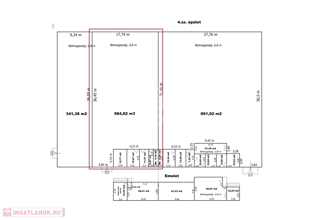 A helyiséghez tartozik 55m2 iroda, szociális rész is.