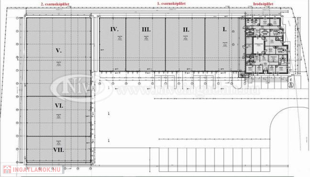 Terület: 8200 m2-es bekerített, összközműves, parkosított, térkövezett, felszíni parkolókkal ellátott.