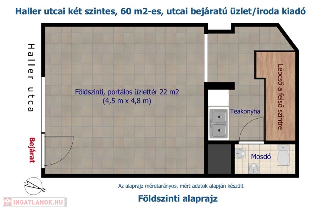 A 31 m2-es földszinten UTCÁRÓL NYÍLÓ, VILÁGOS ÜZLETHELYISÉG, valamint egy teakonyha és mosdó áll rendelkezésre. A 29 m2-es, szintén ablakos felső szintre – az alaprajz szerinti kiépítésben – belső lépcső vezet, mely akár az üzlet elejébe is áthelyezhető.