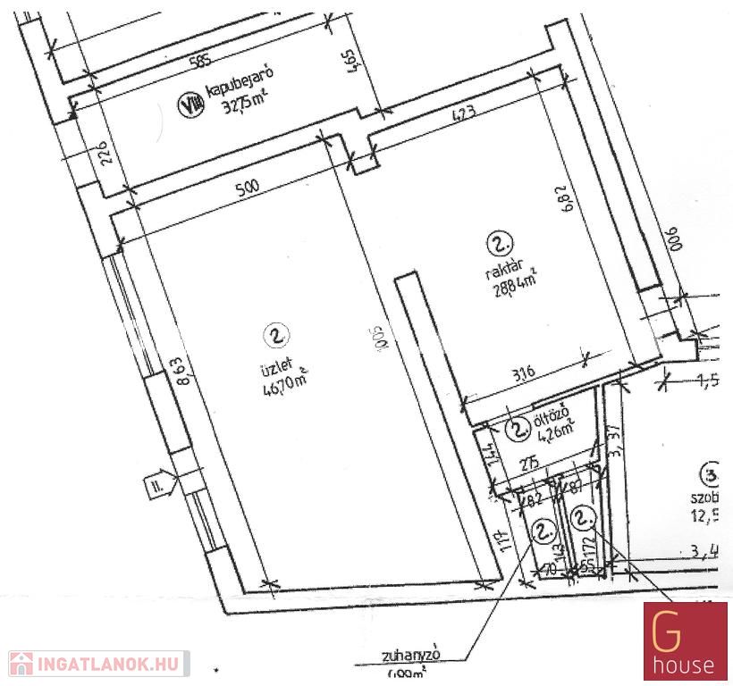 Helyiségek: eladótér, kézmosó, WC, zuhanyzó, kb. 8 m²-es raktár