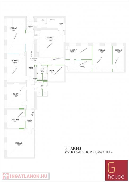 9 iroda, telekommunikációs szoba, felszerelt teakonyha, tágas közlekedőterek, valamint külön női és férfi mosdó található. A 13-34 m2 alapterületű irodák bútorozottan vagy bútorozatlanul is bérbe vehetők.