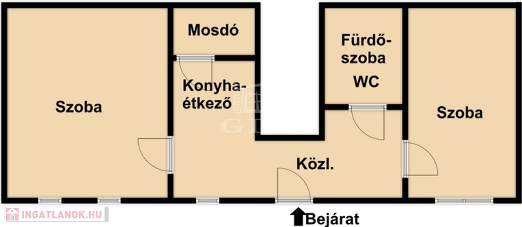 Elosztása: 2 különnyíló szoba, zuhanyzós fürdő WC-vel, külön WC, konyha-étkező, előszoba és közlekedő.