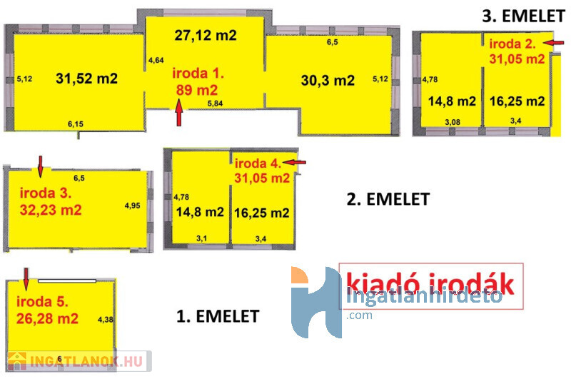Irodák 27 m2-től 90 m2-ig bérelhetőek.
