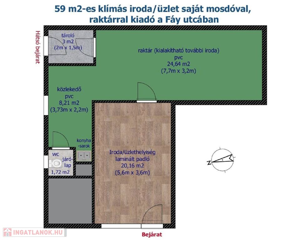 Ez a földszintes, tégla építésű ingatlan rendelkezik egy közvetlen bejáratú, 20 m2-es, laminált padlós, világos, ügyfélfogadásra is alkalmas, klimatizált irodával, melyhez csatlakozik egy pvc burkolatos, közel 25 m2-es, akár további irodai vagy üzlettérré alakítható raktárhelyiség. A raktárhelyiség – az alaprajzon látható módon – megközelíthető egy hátsó bejáraton és egy 3 m2-es, további tároló helyiségen keresztül is.