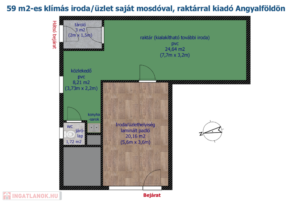 Ez a földszintes, tégla építésű ingatlan rendelkezik egy közvetlen bejáratú, 20 m2-es, laminált padlós, világos, ügyfélfogadásra is alkalmas, klimatizált üzlethelyiséggel, melyhez csatlakozik egy pvc burkolatos, közel 25 m2-es, akár további irodai vagy üzlettérré alakítható raktárhelyiség. A raktárhelyiség – az alaprajzon látható módon – megközelíthető egy hátsó bejáraton és egy 3 m2-es, további tároló helyiségen keresztül is.