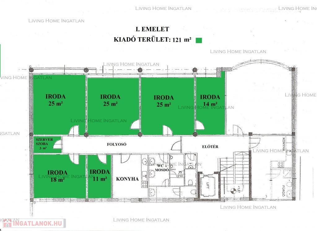 A teljes szinten belül egy vagy több iroda is bérelhető: 36 m2, 64 m2, 100 m2, 121 m2 terület.