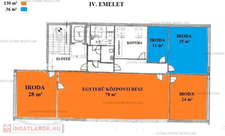 A teljes szinten belül egy vagy több iroda is bérelhető: 60 m2, 130 m2, 166 m2, 202 m2 terület.