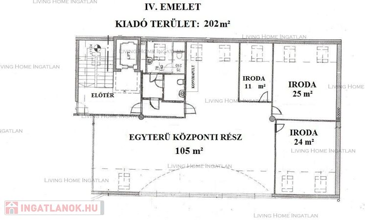 A teljes szinten belül egy vagy több iroda is bérelhető: 60 m2, 130 m2, 166 m2, 202 m2 terület.
