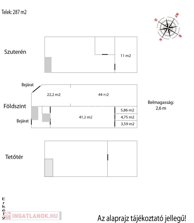 A ház 3 szintből áll, az alaprajzon látható elosztással és egy kis udvarral, ahol ki lett alakítva egy árubepakoló rész ill. akár autóval is beállhatunk.
