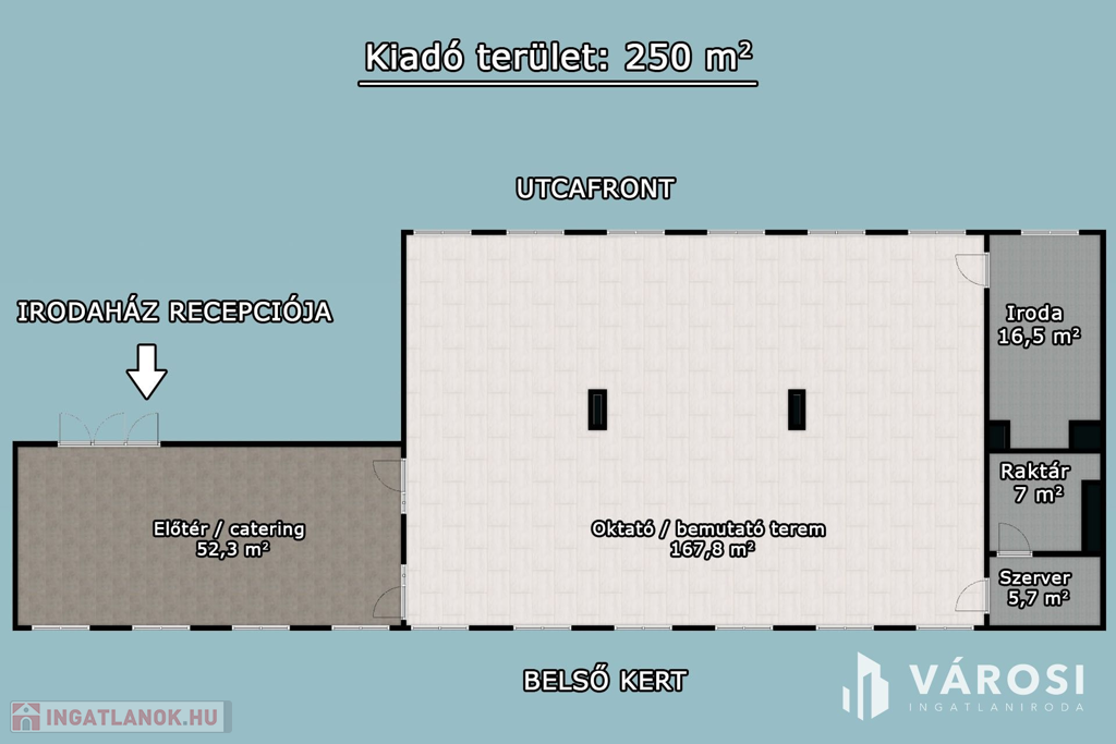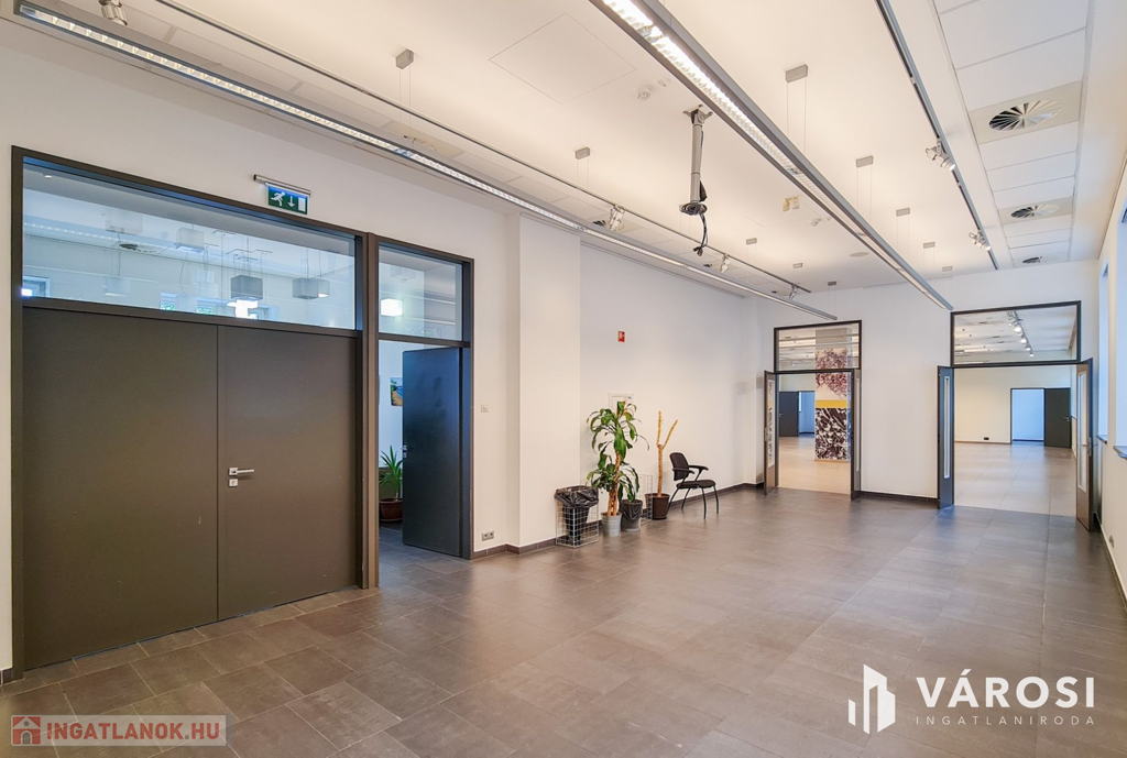 Jelenleg 2 nagyobb teremből (52 m2 + 168 m2), valamint 2 db irodának, raktárnak használható helyiségből áll, de a bérlő igényei szerint át is alakíthatja 8 – 10 db kényelmes méretű irodává / bemutatóteremmé.