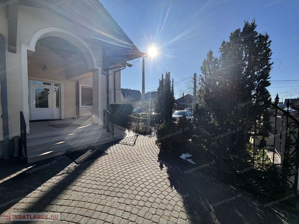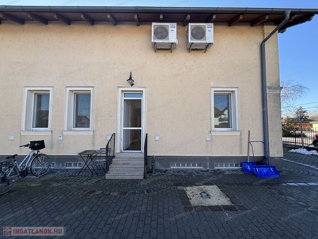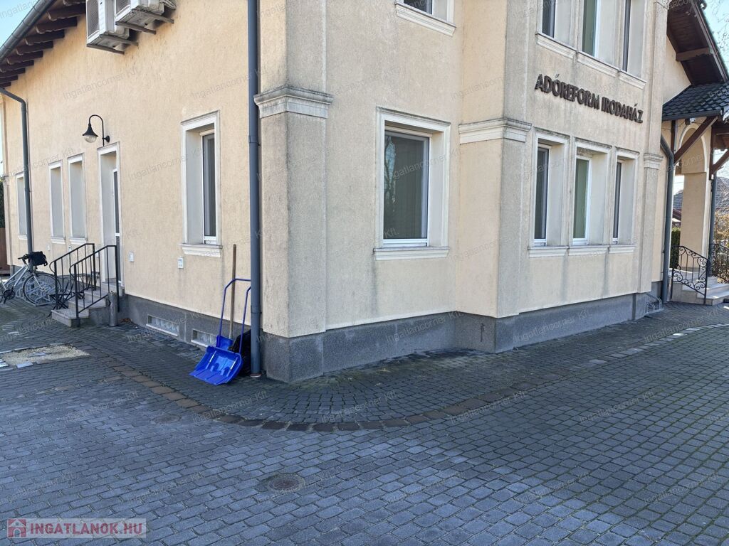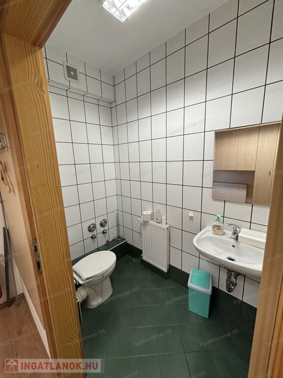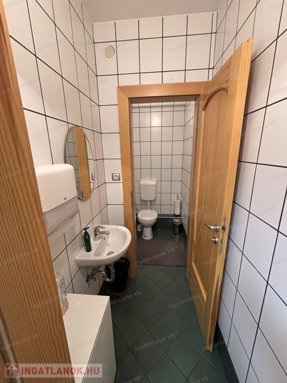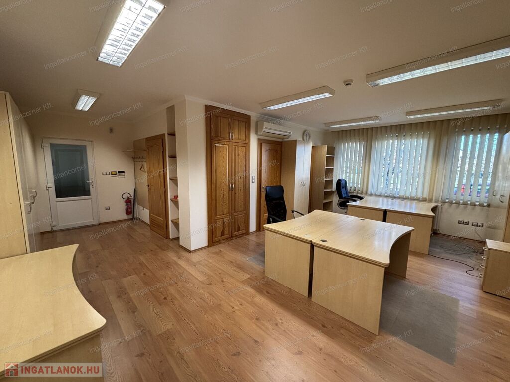 Az iroda 4-6 fő részére alkalmas, elosztása egy nagyobb irodarészből, egy vezetői helyiségből, konyhából, 2db mosdó helyiségből és 2db WC-ből áll. Két bejárata van, az egyik az irodaházból, a másik az udvarról.
