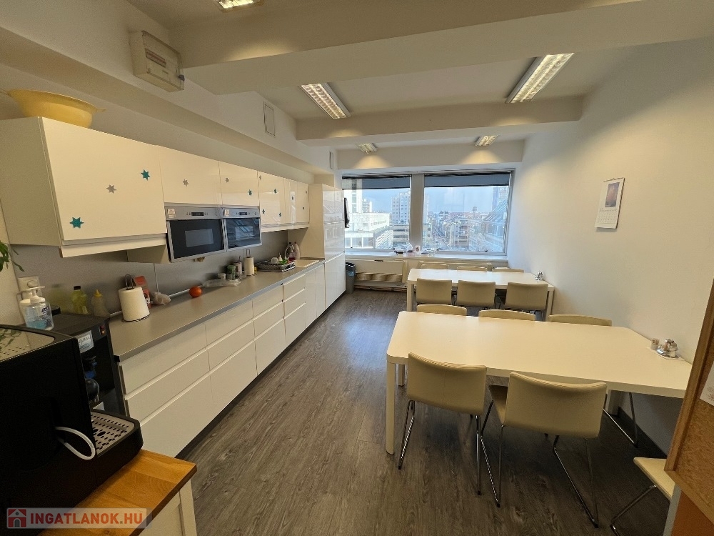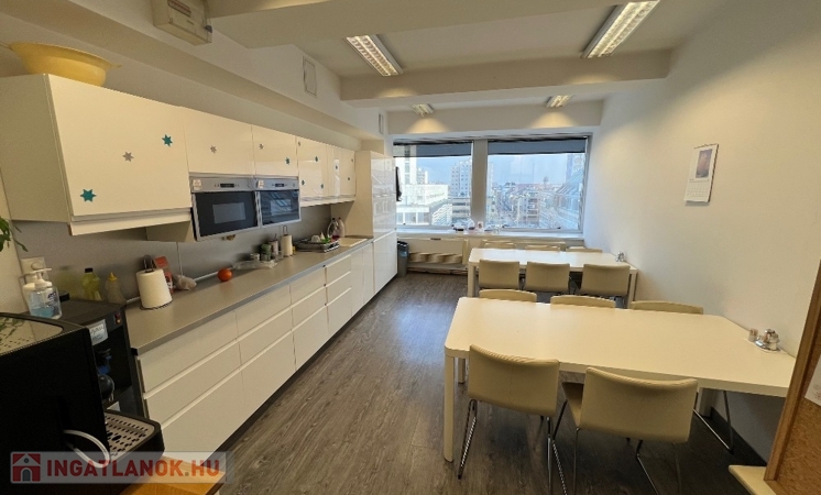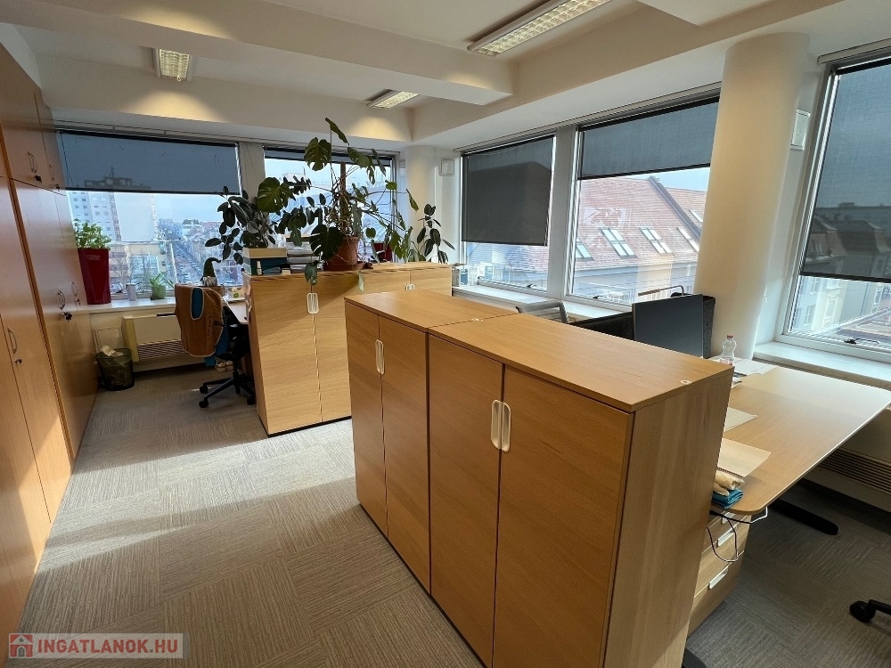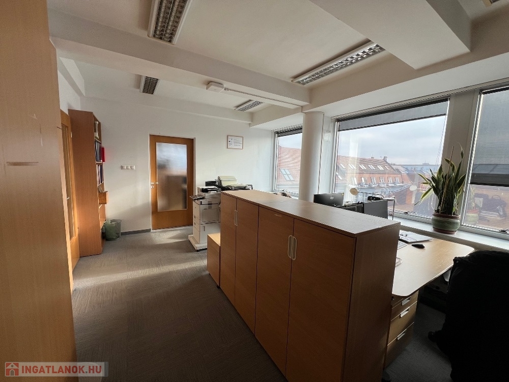 Győr-Belvárosának rendkívül kedvelt részén, Baross úttól, Széchenyi tértől pár másodperces sétatávolságra, rendezett, tiszta, liftes irodaház 5. emeletén, 157 m2-es tárgyalóból és 3 db méretes irodából álló, (17 m2, 26 m2, 29 m2) továbbá saját teakonyhával és szociális egységgel felszerelt, nagy üvegportálos, összesen 306 m2-es bútorozatlan iroda kiadó.