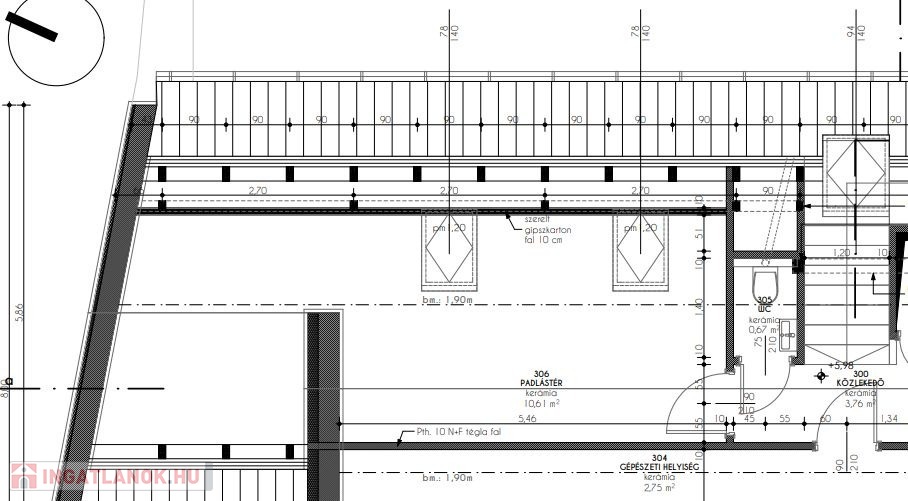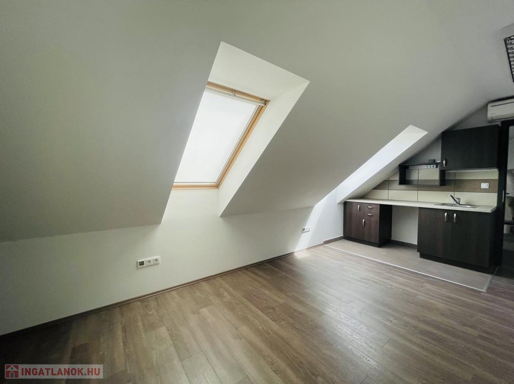 Az épület modern geotermikus fűtésű, második emeleten tetőtérben elhelyezkedő iroda 20 m2-es tartozik hozzá egy minikonyha és saját mosdó. Egy légterű iroda amit egy fél fal választ el egy hátsó tároló résztől. Alkalmas szolgáltatás vagy iroda használatra. Légkondícionált.