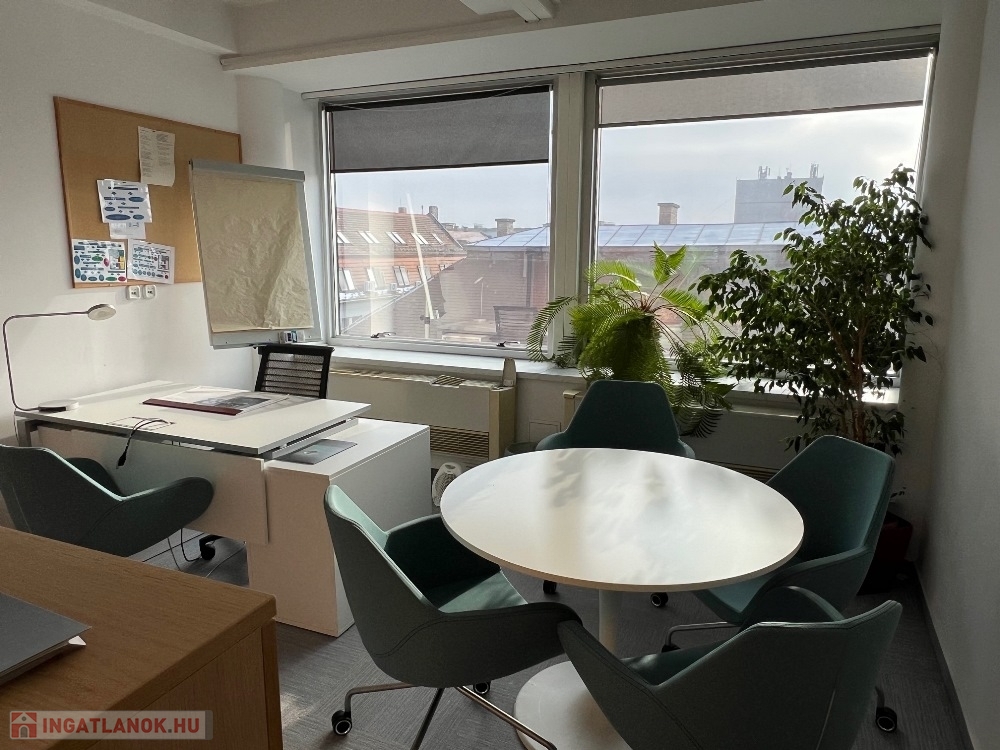 Győr-Belvárosának rendkívül kedvelt részén, Baross úttól, Széchenyi tértől pár másodperces sétatávolságra, rendezett, tiszta, liftes irodaház 5. emeletén, 157 m2-es tárgyalóból és 3 db méretes irodából álló, (17 m2, 26 m2, 29 m2) továbbá saját teakonyhával és szociális egységgel felszerelt, nagy üvegportálos, összesen 306 m2-es bútorozatlan iroda kiadó.