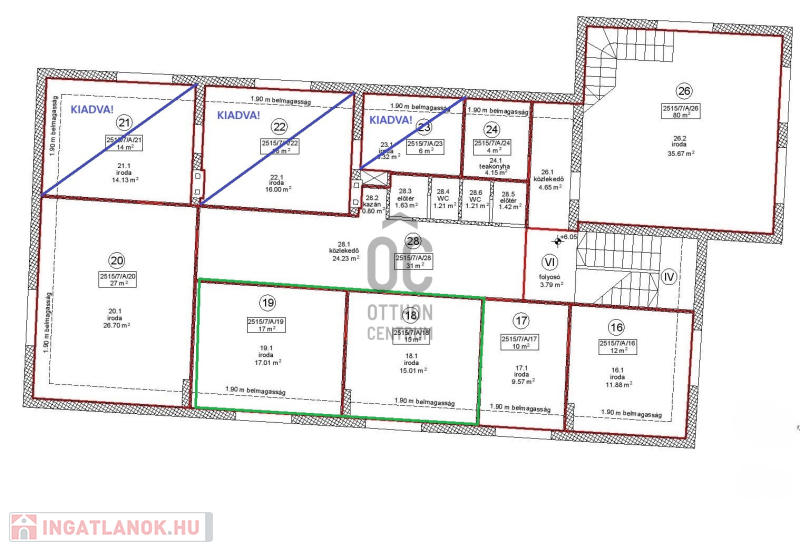 - A hirdetésben található iroda 32 m2 alapterületű, a szintrajzon a 18, 19. számú együtt.