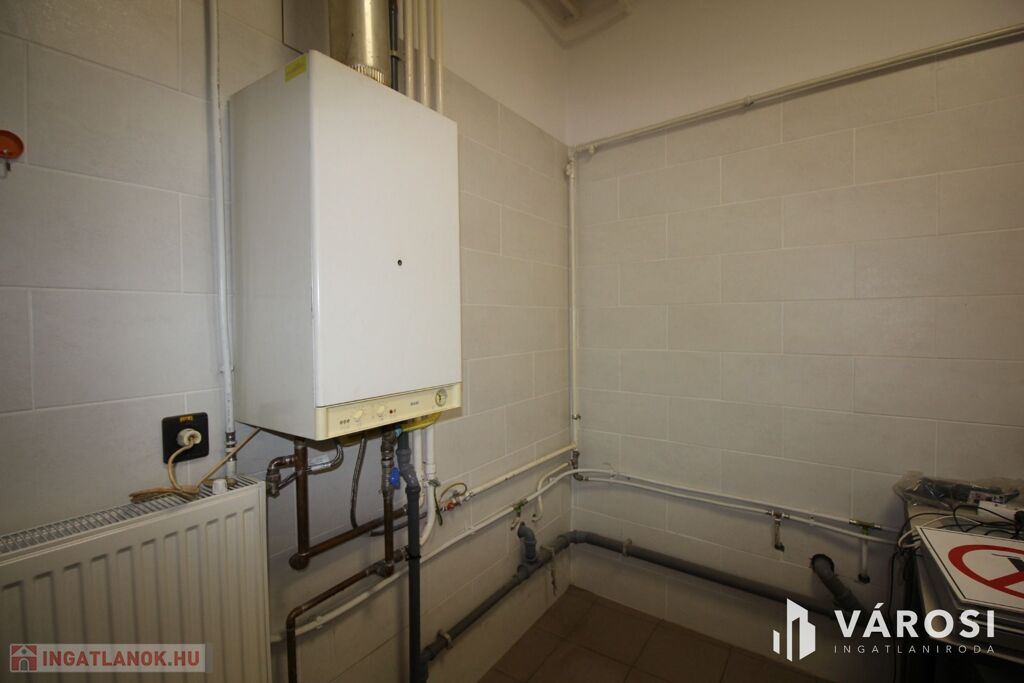Fűtése gáz-cirkó, a melegvizet bojler biztosítja. A kirakatüvegek hungaropán üvegezésüek, így a rezsiköltség alacsony. A padozat hidegburkolat. Víz, szennyvíz csatorna bekötve. Iroda, 2 mosdó, tusoló áll rendelkezésre. Kamerával, riasztóval felszerelt ingatlan.