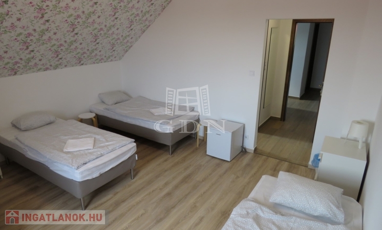 A kétszintes épület emeleten négy (2db 4 ágyas és 2db 3 ágyas), önálló fürdőszobás apartman, illetve egy teakonyha került kialakításra.