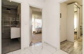 Rögtön szembetűnik a minőségi anyaghasználat a hidegburkolatoktól kezdve, az épített konyhán át, a lépcsőház edzett üvegkorlátjáig és még sorolhatnám. A modern belső teret, mely tágas és világos, a letisztultság jellemzi, megfűszerezve a beépített mennyezetvilágítás adta hangulattal. Az olasz designbútorok csak tovább emelnek azon az érzésen, hogy jó itt lenni. Az emeleten elhelyezkedő négy hálóhelyiség hotelszobák kényelmével vetekszik. Mindegyik teljesen berendezett, tévével, légkondicionálóval felszerelt és kapcsolódik hozzá egy kisebb, vagy nagyobb erkély. Ablakos Wellis fürdőszobái is tovább fokozzák a kényelmet. A helyiségek pontos elrendezését, méreteit szintenkénti alaprajzokon szemléltetem.