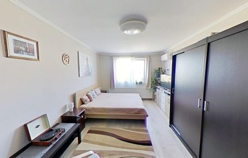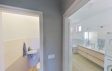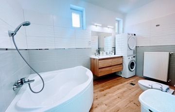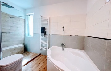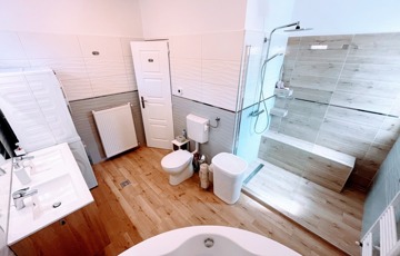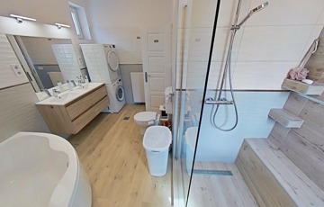 A nagyméretű fürdőben helyett kapott egy gyönyörű, erdei kilátással rendelkező zuhanyzó, egy sarokkád, wc, valamint egy dupla mosdó is. Természetesen egy külön wc is rendelkezésre áll még. A házban az összes szaniter minőségi, Hansgrohe termék.