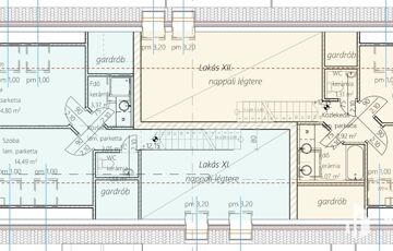 A társasház jellemzői: földszinti lakások és üzlethelyiségek, következik 3 szint plusz tetőtér.