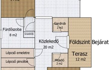 • Földszint: Fedett terasz, előtér, gardrób, vendég mosdó, nagy nappali teraszkapcsolattal, hálószoba, fürdőszoba, két szoba, konyha-étkező.