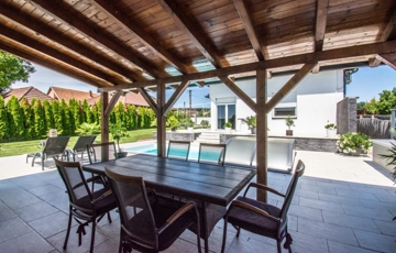 A nyári kiülő, több funkcióra is kényelmesen használható. A teljesen felszerelt és gépesített konyhának köszönhetően nem kell a házba bemenni, és minden konyhai funkció komfortosan elérhető egy társasági vagy családi összejövetel alkalmával.