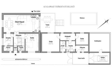 - Földszintes ház: ~60,00 m2, 2 db szoba, konyha, fürdő, közlekedő, előszoba