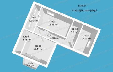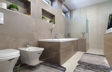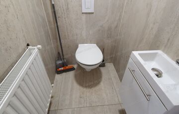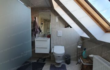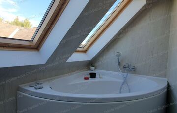 Az emeleti fürdőben kád és zuhany áll rendelkezésre, a fényt 4 db VELUX ablak biztosítja.