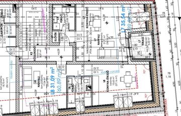 Tetőtéri L7 lakás bruttó 39,98 m2 (nettó 35,54 m2 ) helyiségei: amerikai konyhás nappali, fürdő WC-vel, előszoba, háztartási helyiség WC-vel, közlekedő. ERKÉLY 5,32 m2
